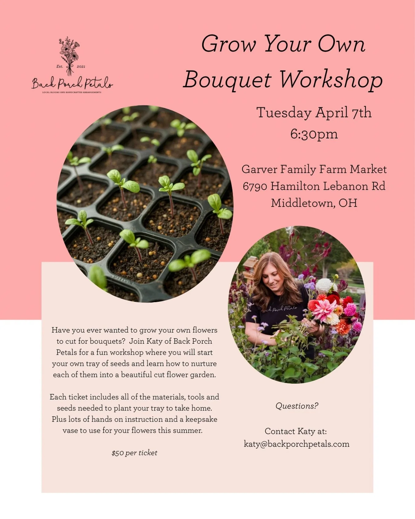 Hi, I’m Katy! I have always had a passion for gardening and flower design. I started growing cut flowers in 2018, and I fell in love with using locally grown blooms in my designs.